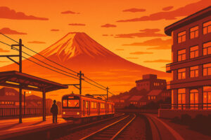 朝の富士山駅。吐く息が白く染まる頃、ホームに立つと正面に巨大な富士の姿が現れる。冬の冷気が頬を打ち、その輪郭の美しさに思わず息をのむ。駅舎の屋根の上にまでその影が落ち、街全体が“富士の懐”に抱かれているように感じられる瞬間だ。