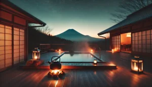 温泉から立ち上る湯気と、焚き火の灯り、その向こうに静かに浮かぶ富士のシルエット。