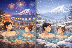 個人的に「これは気持ちよさそうだな」と思うのは、冬の澄んだ朝です。空気が締まっていて、富士山の輪郭が見えやすい日が多く、朝風呂の時間帯とも相性がいい。朝のまだ静かな時間に温泉へ入って、富士山エリアらしい空気の中で一日を始める。想像するだけで、ちょっと行きたくなります。