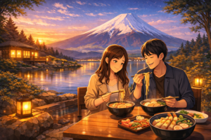 たとえば、富士河口湖町で気になっていた店に行って、お腹が満たされたあとに湖畔を少し歩く。それだけでも十分気持ちいいのですが、さらに夕方に「ゆらり」のような温泉へ向かうと、一日の満足度が一段上がります。あるいは富士吉田で吉田のうどんをしっかり味わって、そのあとふじやま温泉でゆっくり汗を流してから帰る。この流れ、かなり完成度が高いです。食べる楽しさと、温泉でほどける気持ちよさがつながると、番組の追体験がただの“答え合わせ”ではなく、自分の旅としてちゃんと残ります。