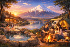 しかも富士山は、景勝地である前に、世界文化遺産にも登録された「信仰の対象と芸術の源泉」です。つまりこの山の魅力は、登ることだけでも、眺めることだけでも語り尽くせません。暮らすように滞在し、遊ぶように親しみ、湯に浸かり、土地の味を知ってはじめて、富士山は一枚の写真では届かない厚みを見せてくれます。この記事では、「富士山が見える温泉付きマンション」「富士山 オートキャンプ場 温泉」「大江戸温泉 富士山」「せっかくグルメ 富士山 温泉」という4つの検索意図を、ひとつの滞在体験としてつなぎながら、泊まるためではなく、少しだけ富士山と暮らすための案内をお届けします。