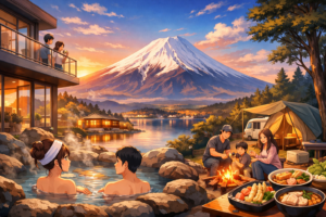 そして、ここが富士山旅のいちばん面白いところです。温泉は、ただ汗を流す場所ではありません。旅の終わりを気持ちよくしてくれる場所であり、次にまた来たくなる理由を作ってくれる場所でもあります。窓の外に富士山がある暮らしを想像するのも楽しい。キャンプのあとに温泉へ向かう流れを考えるのも楽しい。グルメのあと、どの湯に入って帰ろうかと考えるのも楽しい。こうして見ていくと、温泉は宿の代わりではなく、富士山と過ごす時間そのものを豊かにしてくれる“旅の核”だと、僕は本気で思っています。